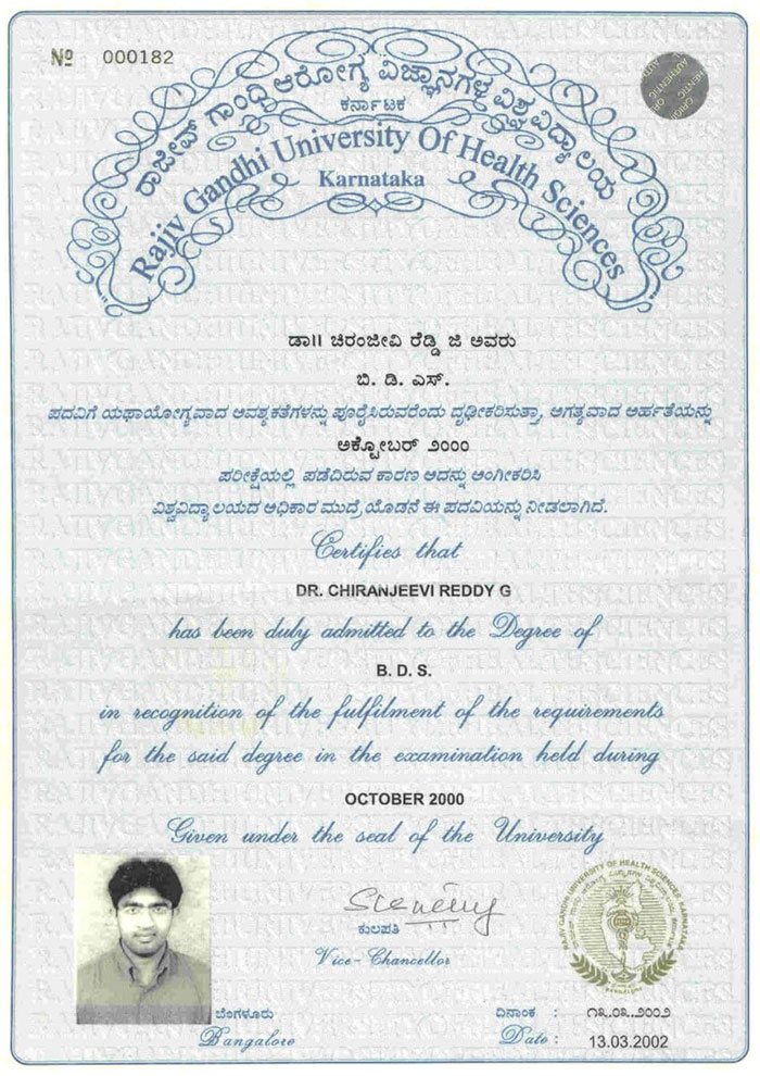 Dr Chiranjeevi Reddy has been associated with Narayana Hrudayalaya Dental Clinics, Axiss Dental Clinics, Dentista, Frazer Town and various dental clinics across Bangalore and Andhra Pradesh.